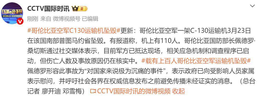 总台记者获悉,当地时候3月23日,一架附庸于哥伦比亚空军的C-130“鼎力神”军用输送机在该国南部普图马约省一农村地区坠毁。有报说念称,机上有110东说念主。